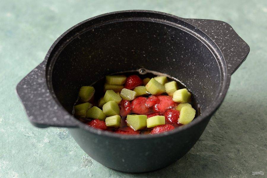 Затем добавьте клубнику и ревень. Снова доведите до кипения, проварите 10 минут.