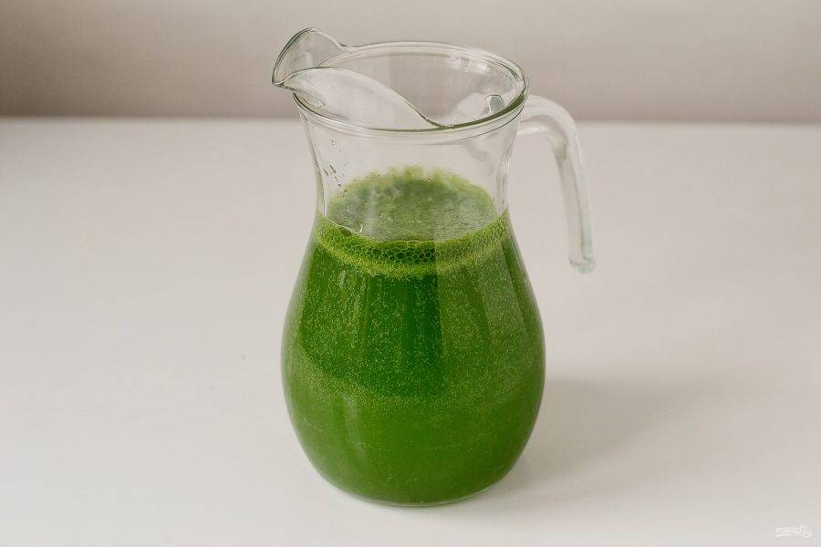 Влейте в кувшин лимонный сок, щавель, добавьте сироп оставшуюся газированную воду.
