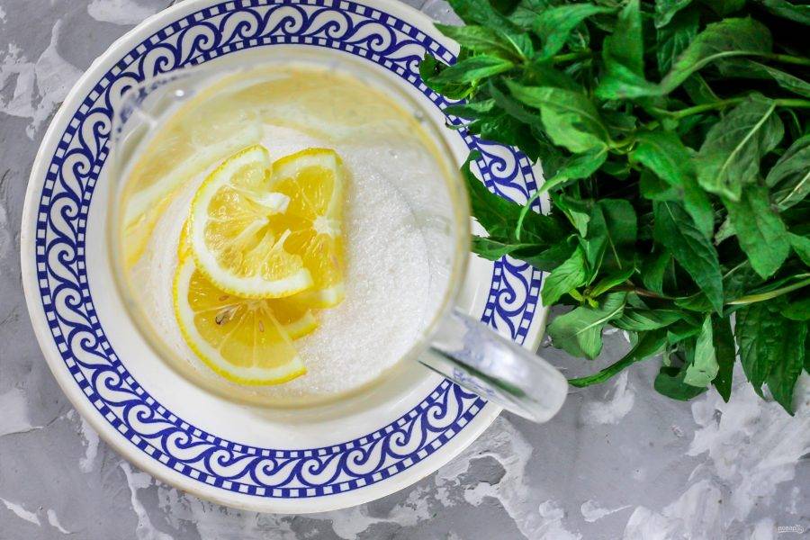 Четверть лимона нарежьте ломтиками, удалите косточки и всыпьте вместе с половиной сахарного песка в кувшин.