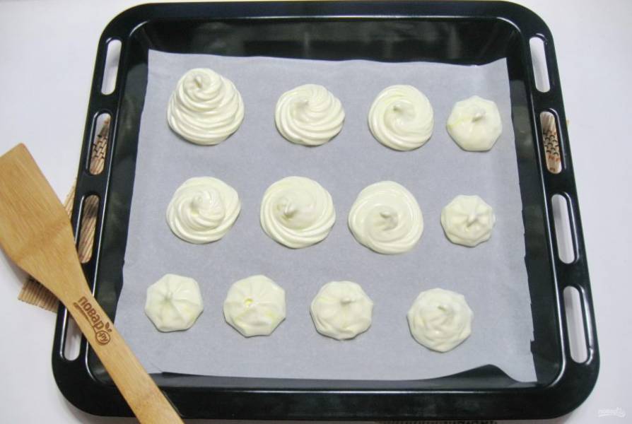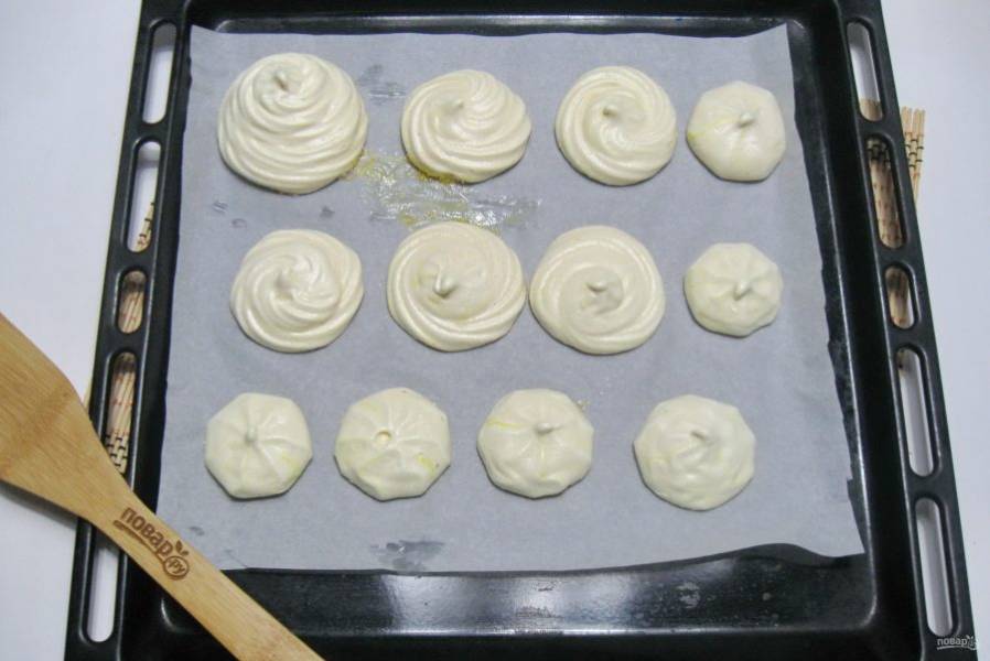 С помощью кулинарного мешка с насадкой отсадите меренгу на противень с пекарской бумагой.