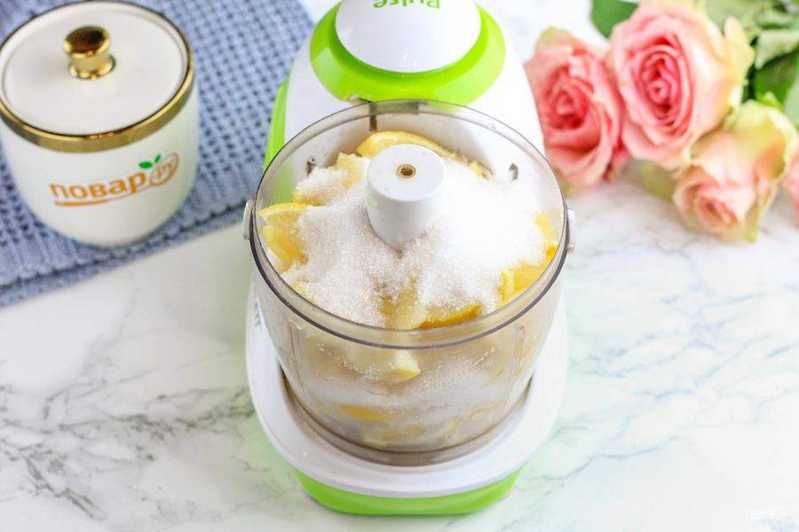 Выложите лимонную нарезку в чашу блендера или кухонного комбайна и всыпьте туда же сахарный песок.