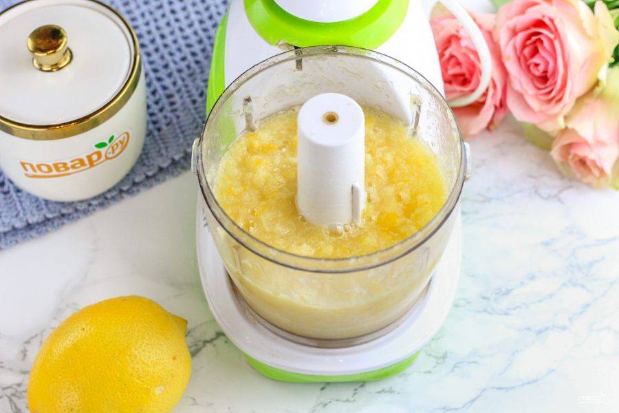 Измельчите все на пульсирующем режиме не менее 4-5 минут, чтобы все ломтики отпюрировались. Можно оставить небольшие части кожуры, чтобы они попадались в начинке.