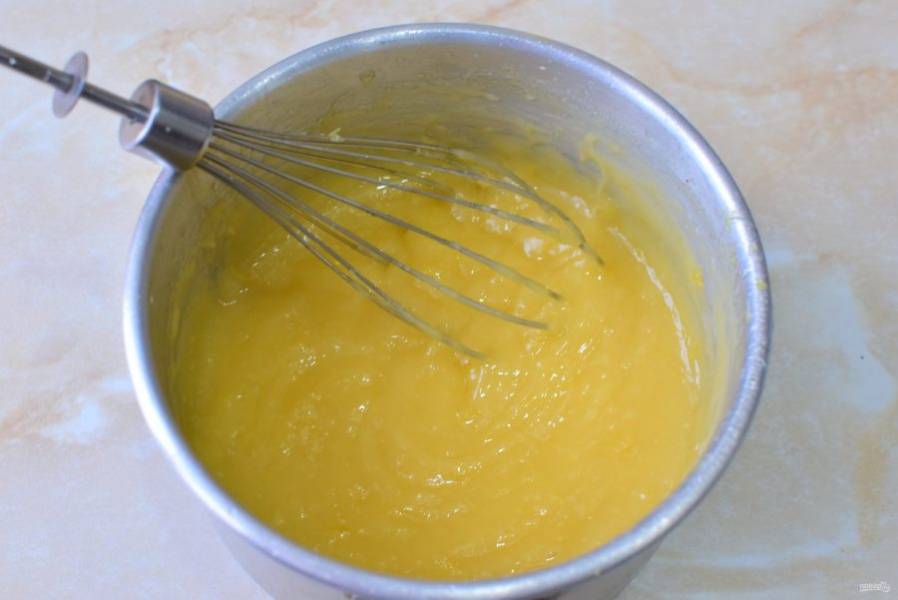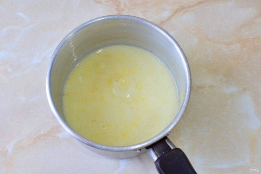 Снимите с лимона цедру и добавьте в сок. Затем подсыпьте сахар и крахмал. Смешайте и поставьте на огонь. Помешивая, доведите до кипения. Масса станет густеть.