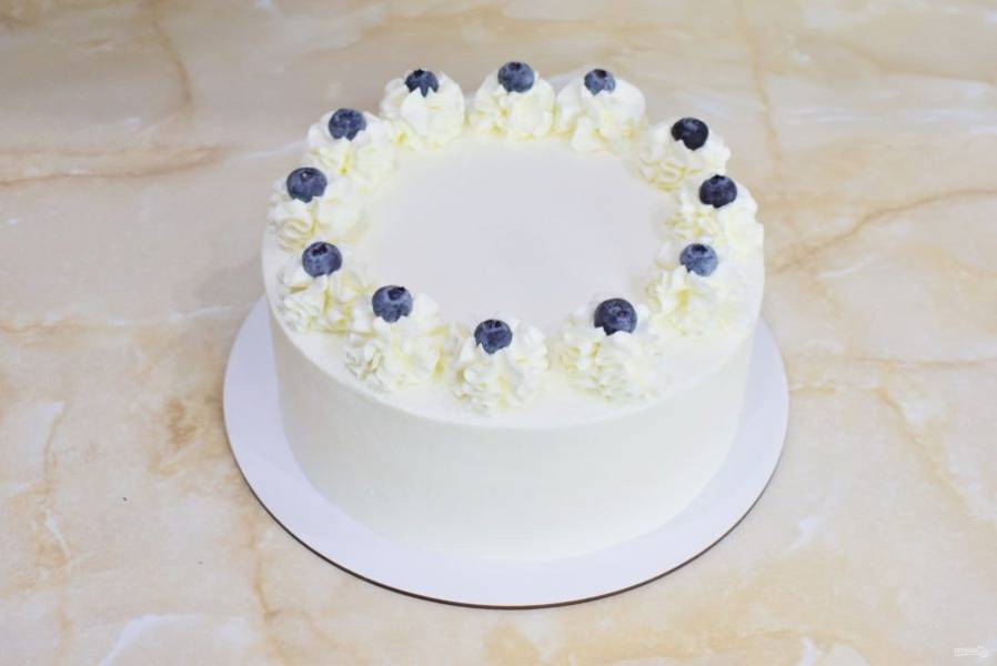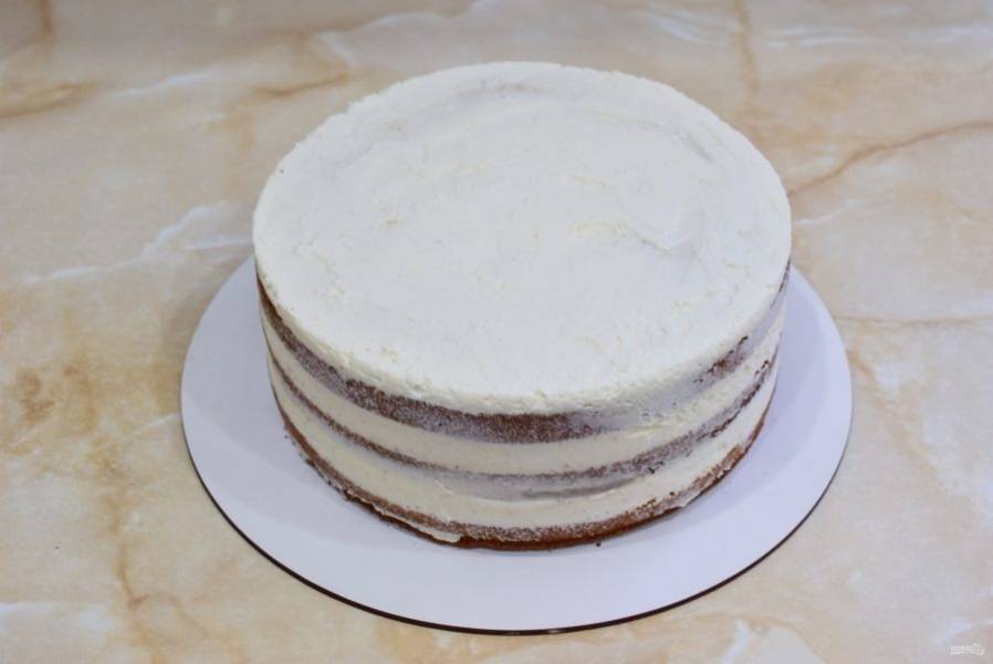 Для внешнего выравнивания сделайте такой же крем. Выровняйте торт сверху и снаружи. Украсьте торт по своему вкусу.