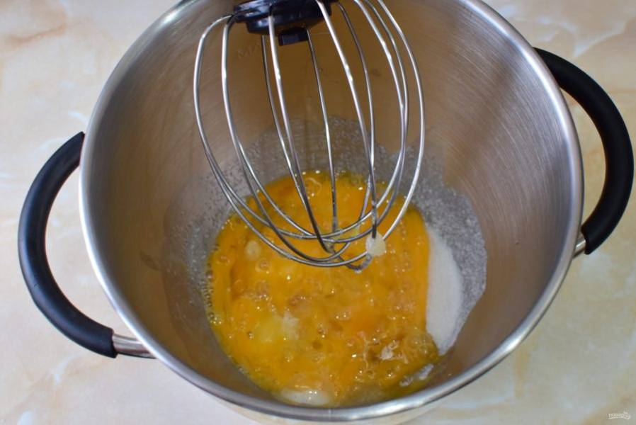 Для приготовления бисквита соедините яйца с сахаром и начинайте их взбивать, постепенно увеличивая мощность миксера до максимальной. Взбивайте до получения пышной светлой массы.