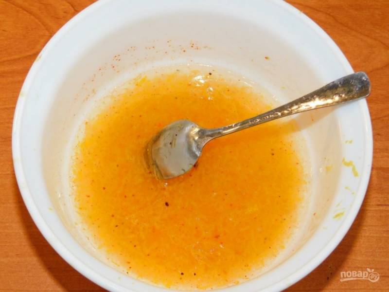 Отдельно соедините лимонный сок, цедру лимона, оливковое масло, соль и специи. Перемешайте.