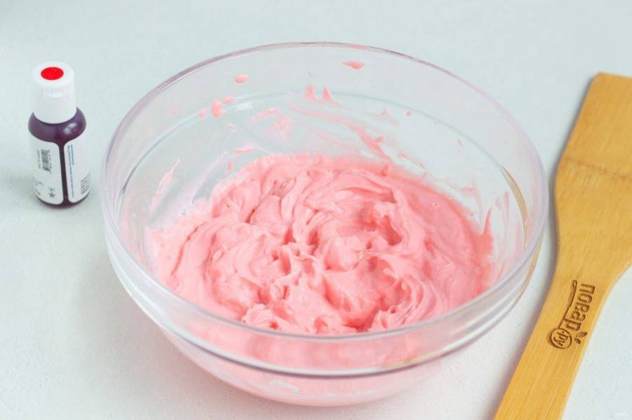 Пока выпекаются кексы подготовьте крем. Сыр взбейте с сахарной пудрой и одной каплей красного красителя. Сахарную пудру регулируйте по своему вкусу. Готовый крем накройте крышкой и уберите в холодильник.