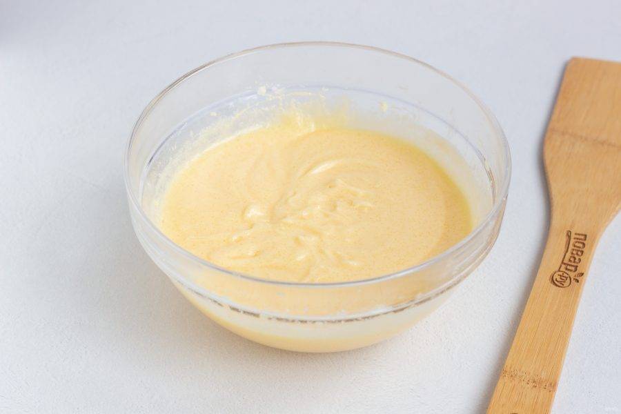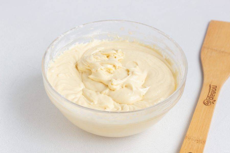 Муку просейте с разрыхлителем и постепенно введите в подготовленную массу. Должно получится шелковистое тесто сметанной консистенции.