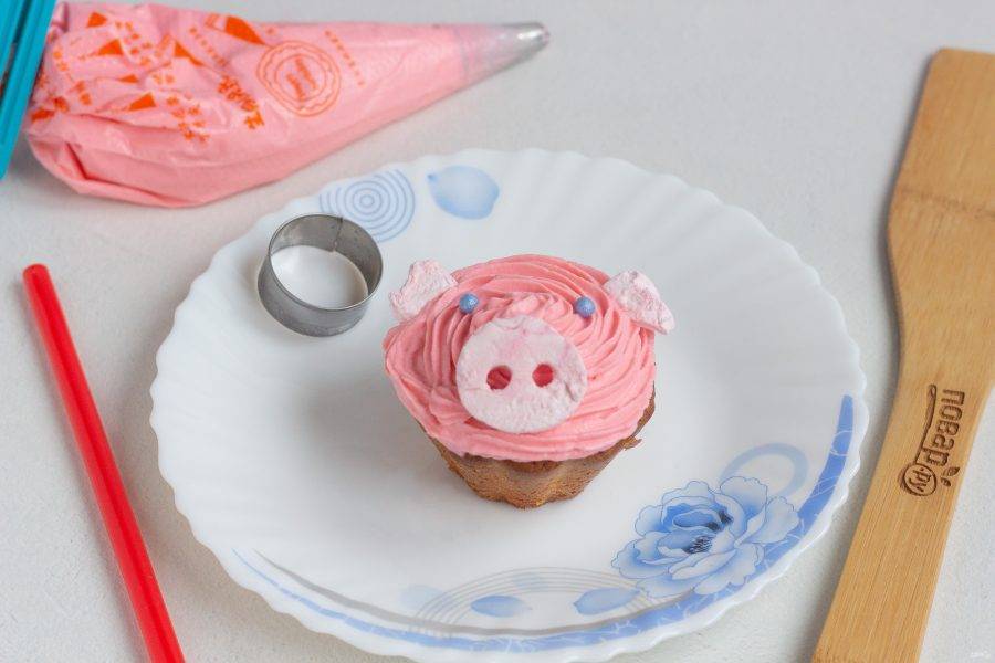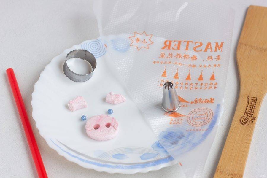 Пока остывают кексы можно подготовить вот такой декор для свинок из зефира. Зефир нарежьте острым ножом пластинами и вырезайте нужные элементы: пяточок и ушки. Для глаз я использовала кондитерские бусины, можно взять шоколадные капли. Ротик можно нарисовать пищевым фломастером или обойтись без него! Также подготовьте насадку и мешок для крема.