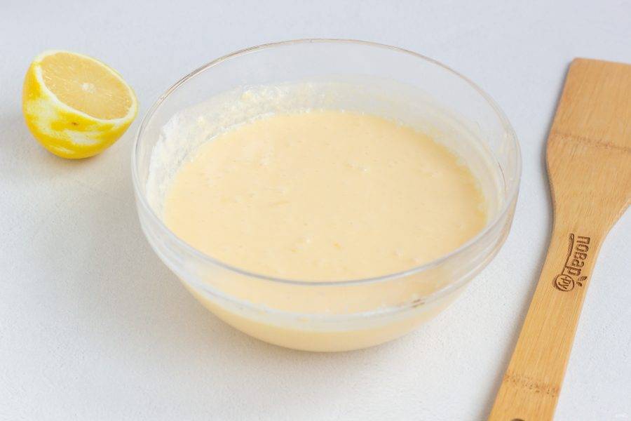 Затем добавьте молоко, цедру половины лимона, 2 ст. ложки лимонного сока. Взбейте всё на низкой скорости миксера.
