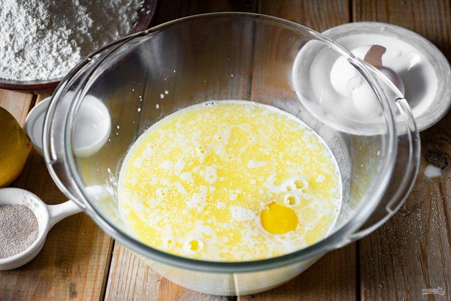 В миску залейте теплое молоко, растопленное на маленьком огне сливочное масло, добавьте сахар, соль, вбейте яйцо. Венчиком все перемешайте.