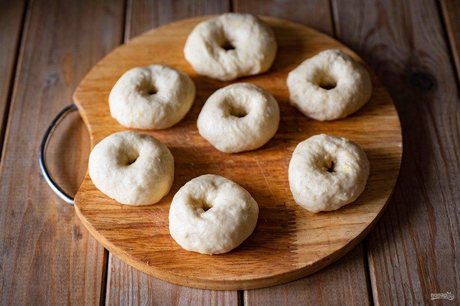 Отделяйте от общей массы теста кусочки весом примерно по 50 грамм. Скатайте из каждого такого кусочка шарик и пальцем продавите в нем отверстие, как на фото.