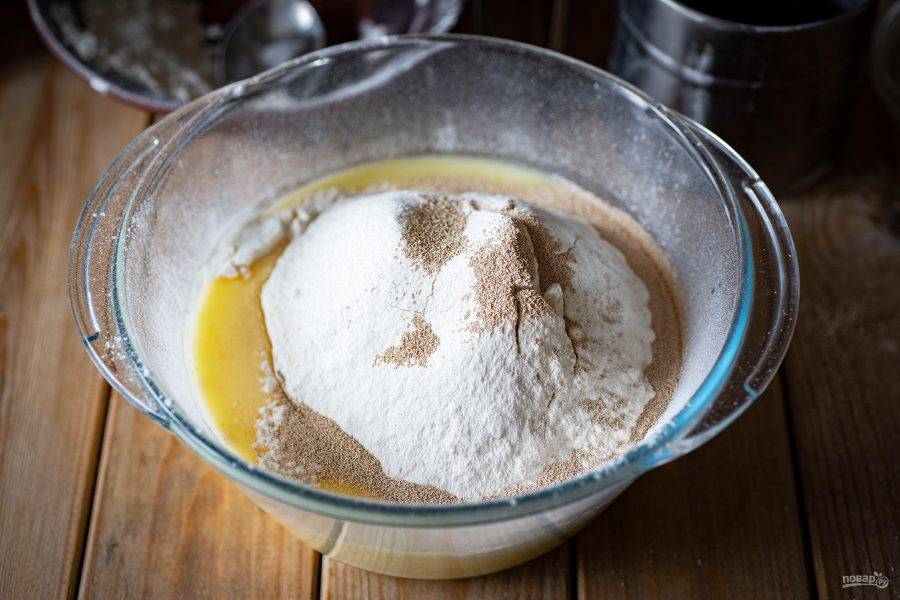 К этой смеси просейте муку, добавьте сухие дрожжи. Сначала ингредиенты перемешайте ложкой, а затем приступайте к замесу руками.