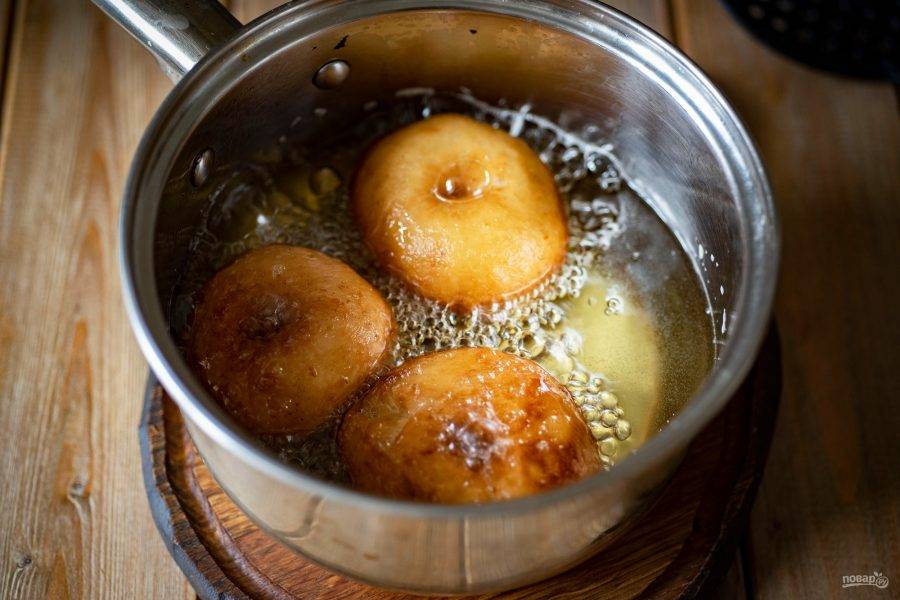 В сотейнике разогрейте на среднем огне обильное количество растительного масла и порциями обжаривайте со всех сторон пончики до появления аппетитного золотистого оттенка. Готовые пончики сначала выложите на кухонное полотенце, избавляясь от излишков растительного масла.