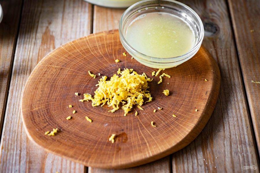 Натрите на мелкую терку цедру крупного лимона и выдавите сок. У меня получилось примерно 80 мл.