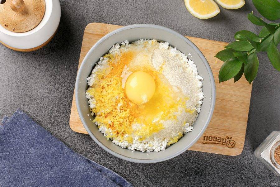 Добавьте манку, сахар, соль, яйцо, куркуму и цедру лимона.