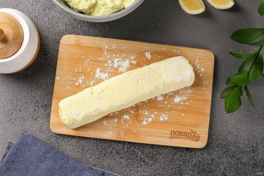 Рабочую поверхность посыпьте мукой. Массу для удобства разделите на две части и сформируйте в форме колбаски.