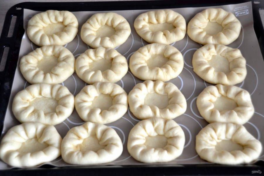 Ложкой или с помощью кондитерского мешка выложите в центр лепешки начинку. Разогрейте духовку до 180 градусов.