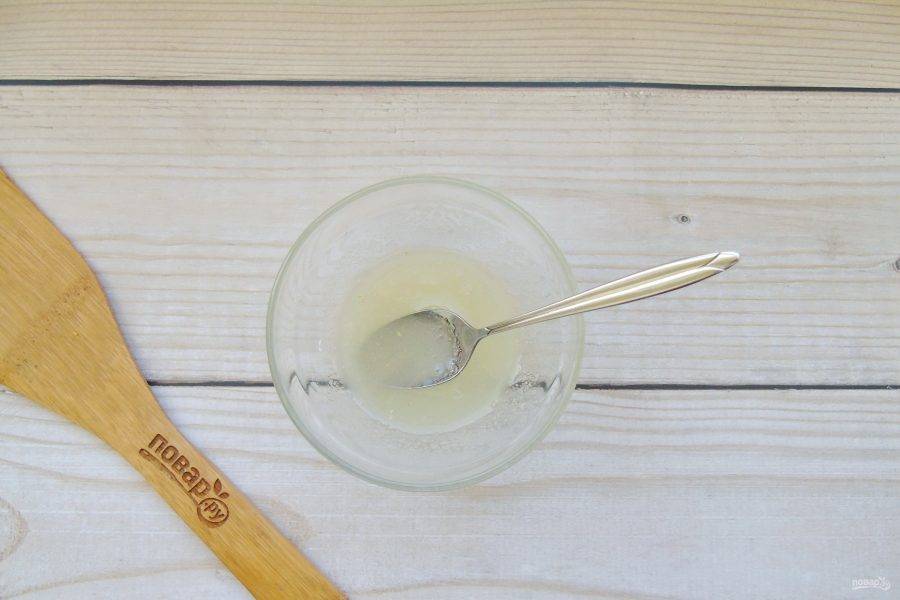 Приготовьте сироп. В мисочке перемешайте лимонный сок и сахарную пудру до полного растворения.