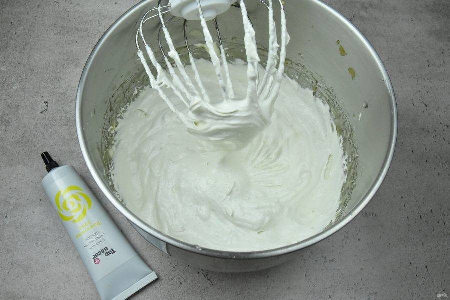 По желанию в зефирную массу можно добавить водорастворимый краситель. Взбивайте еще 10 секунд.