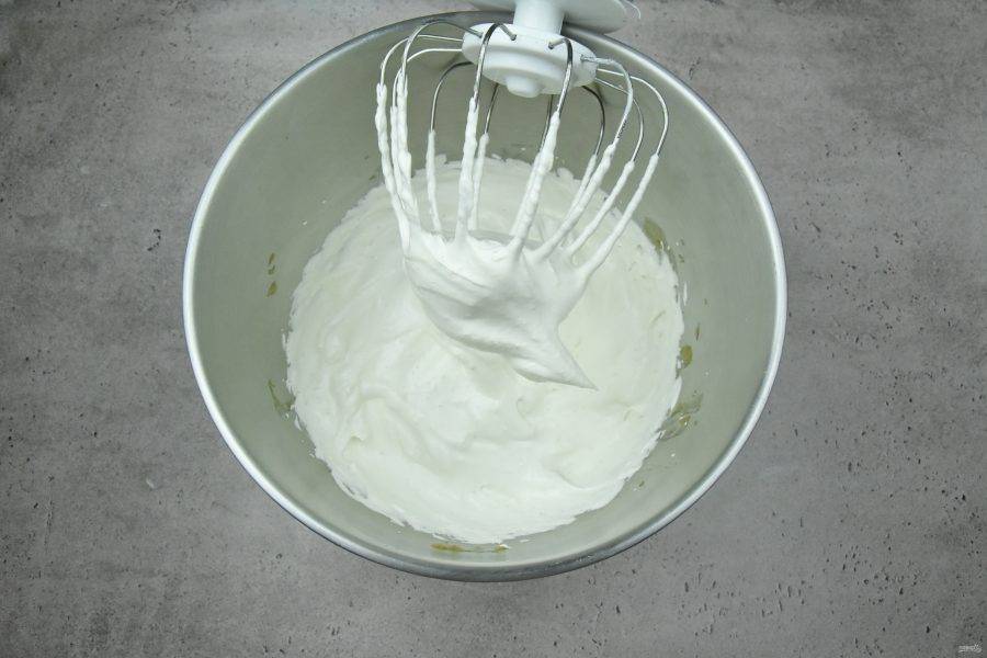 Увеличьте скорость миксера до максимальной и взбивайте зефирную массу до плотной, устойчивой консистенции.