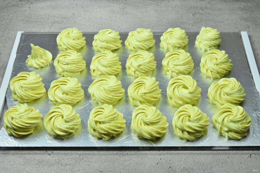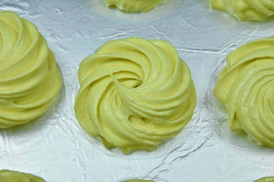 Для оформления зефира подготовьте твердое покрытие и выстелите его пергаментом или фольгой. Отсадите зефир.