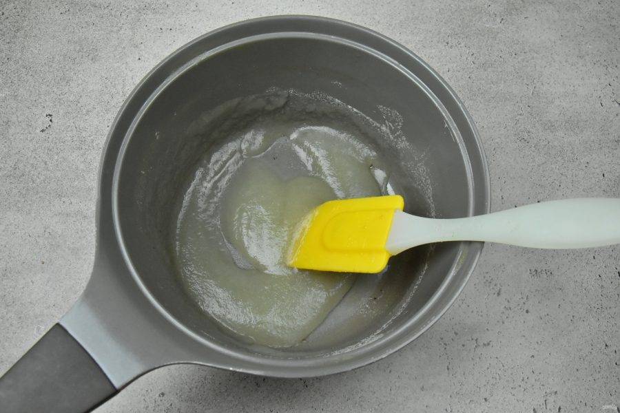 Одновременно с взбиванием зефирной массы начинайте варку сиропа. Для этого размешайте в сотейнике агар и воду. Поставьте на средний огонь и доведите смесь до кисельной, кашицеобразной массы.