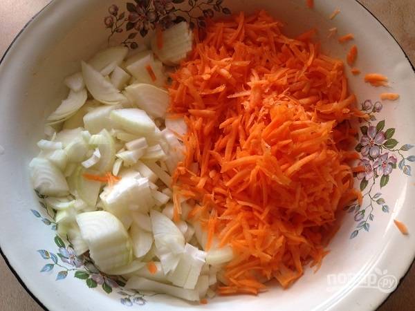 3. Очистим лук и морковь. Лук нарезаем четвертькольцами, морковь натираем на крупной терке. Как видите, моркови и лука у меня получается практически поровну.