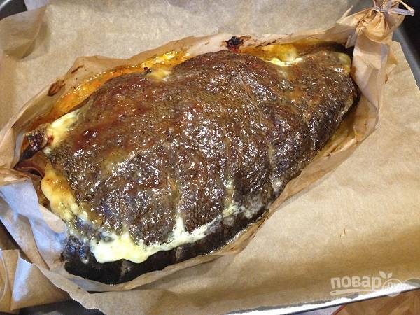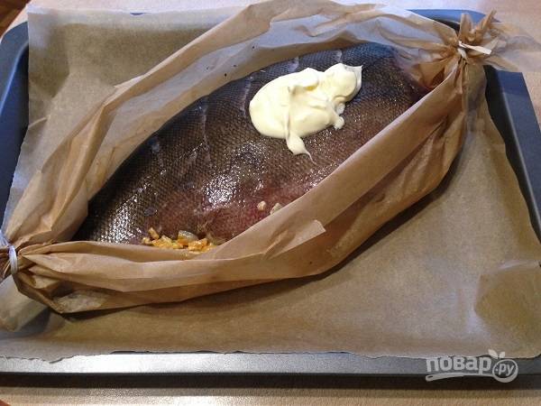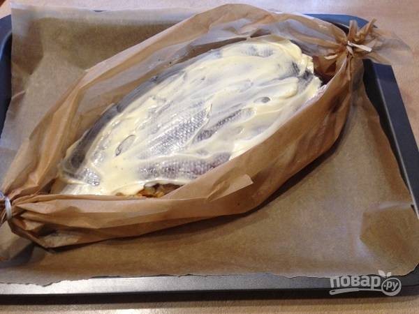 7. Перекладываем рыбу на противень, застеленный еще одним листом пергамента (для того чтобы потом не пришлось мыть противень :). Концы первого пергамента закрепляем, чтобы сок при запекании не вытекал.