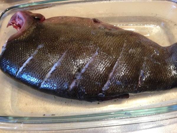 2. Рыба у меня большая, поэтому сделаем неглубокие надрезы по спинке. Сбрызгиваем рыбу внутри лимонным соком и посыпаем снаружи и внутри смесью соли (примерно 2/3 чайной ложки), перца и смеси специй для рыбы. Оставим рыбу хотя бы на пару часов, пусть промаринуется.