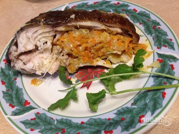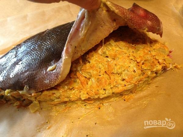 6. Выкладываем линя на лист пергамента, начиняем луком с морковью.