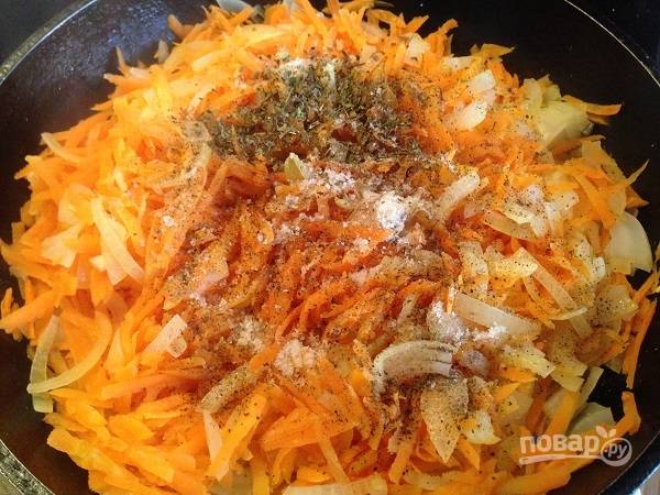 4. Разогреваем на среднем огне сковороду с растительным маслом, тушим под крышкой лук с морковью. Когда они станут мягкими, добавим соль, молотый перец и базилик. Тушим до готовности, стараясь максимально выпарить жидкость.