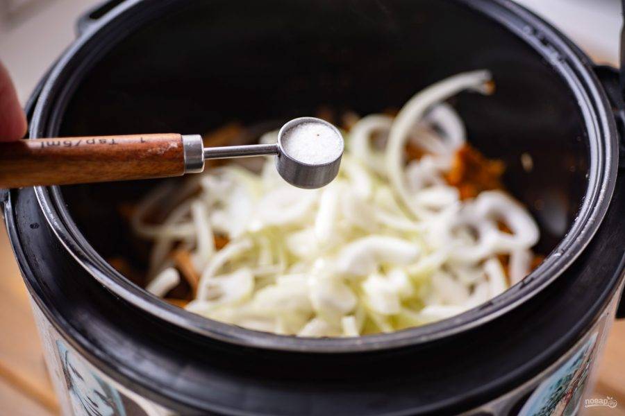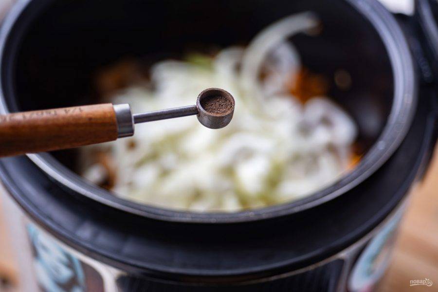 Добавьте молотый перец. Перемешайте, закройте крышку мультиварки и продолжайте готовить грибы на текущем режиме до звукового сигнала.