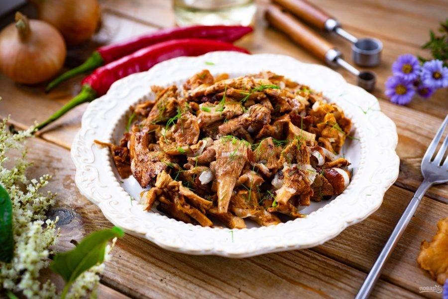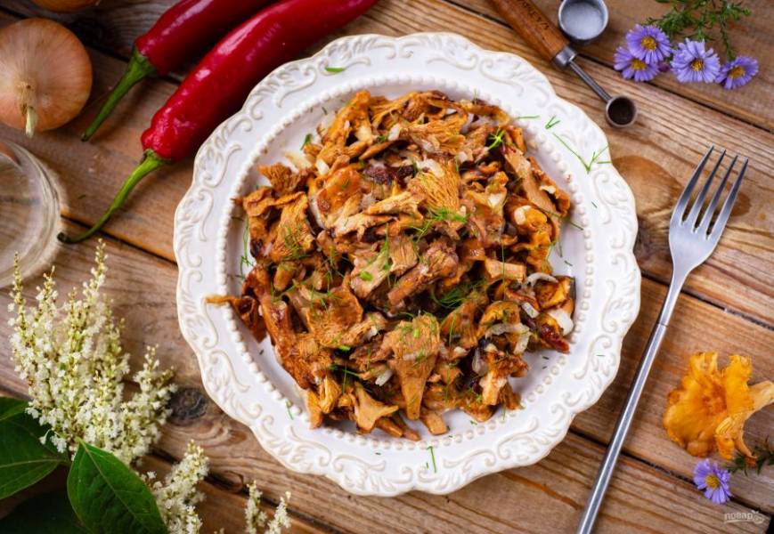 Выложите готовые лисички на тарелку для подачи, чуть присыпьте мелко порубленной зеленью и подавайте к столу.
