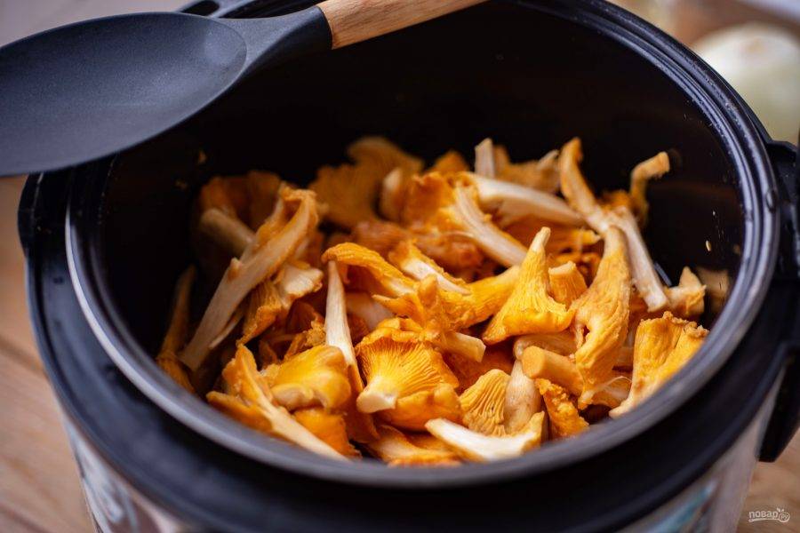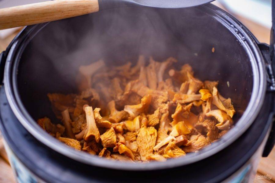 Через 20 минут после того, как вы поставили лисички, откройте крышку мультиварки (не выключая текущую программу приготовления), слейте воду.