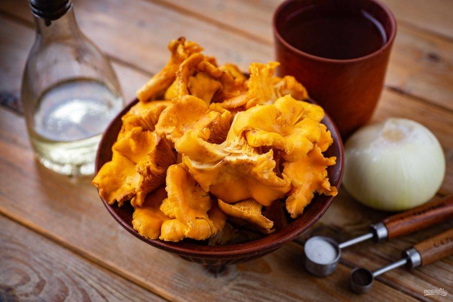 Все ингредиенты соберите по указанному списку. Лисички тщательно переберите и хорошенько промойте. Лук почистите.