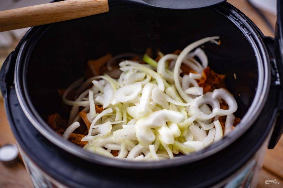 При необходимости крупные грибы нарежьте на более мелкие части, после чего все выложите в чашу мультиварки и залейте воду. Включите режим «Выпечка» на 40 минут.