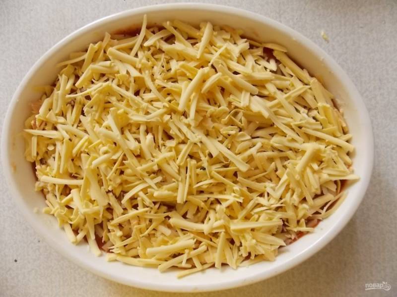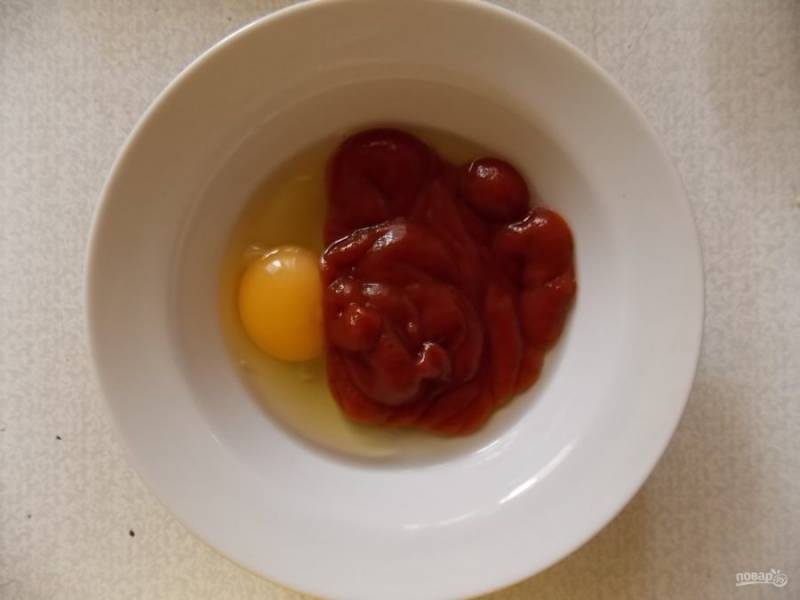 В форму для запекания выложите куриное филе со сметаной и мукой, смажьте смесью из яйца и кетчупа. Затем присыпьте тертым сыром.