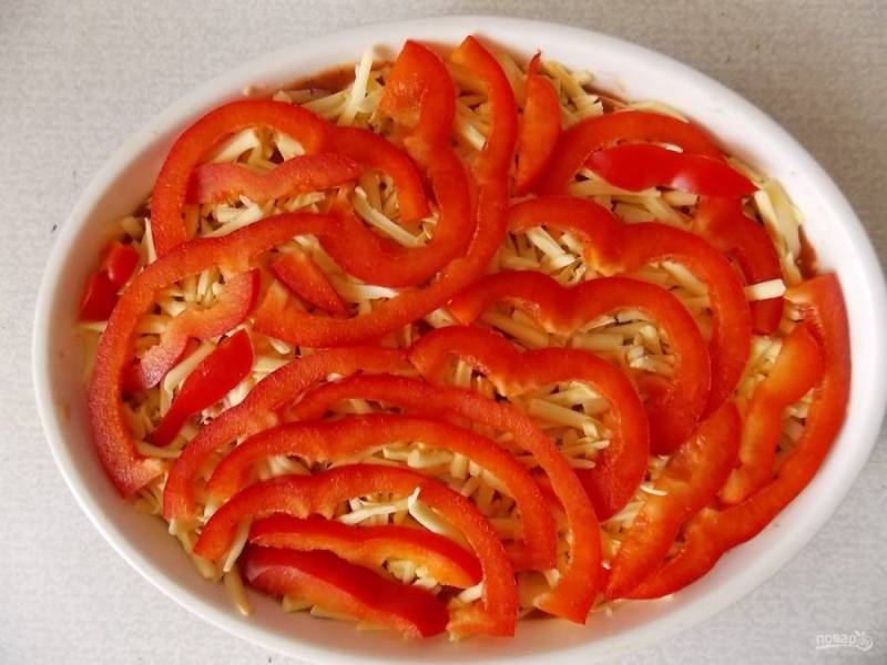 Очистите перец от семян и плодоножки, порежьте полукольцами и уложите на сыр.