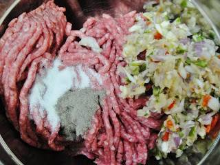 Измельчить на блендере перец, лук, чеснок или мелко порезать. Смешать с фаршем и специями. Хорошо вымесить.