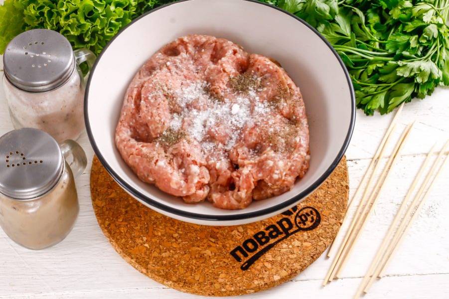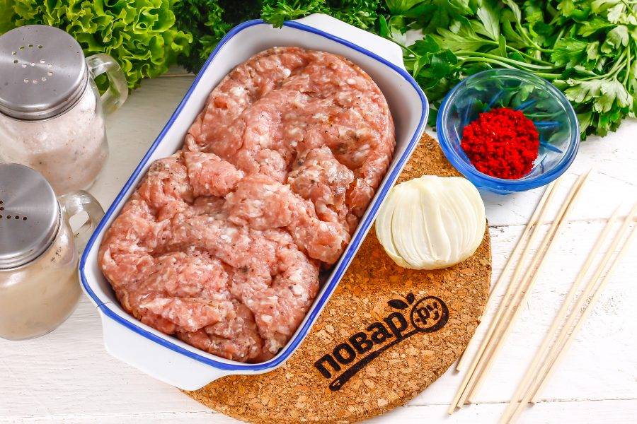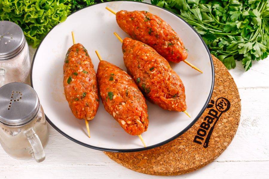 Фарш тщательно перемешайте и охладите в холодильнике примерно 30 минут, затем еще раз тщательно вымешайте, бросая его с руки в тарелку. Таким образом из него выйдет воздух, удалятся пустоты и образуются сальные нити. Охлаждайте фарш еще несколько раз. Затем сформируйте из его частей небольшие округлые котлеты и насадите их на шампур. Использовать можно как деревянные шпажки, так и металлические.