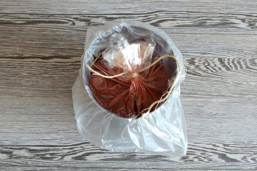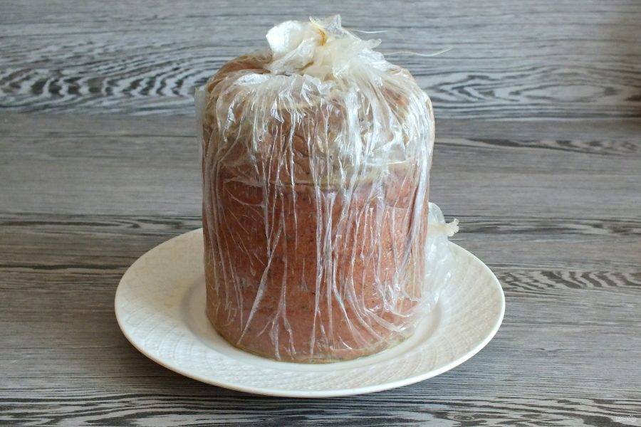 После снимите форму, не удаляя пакеты, уберите в холодильник. Охладите ливерную колбасу в течение 5 часов.