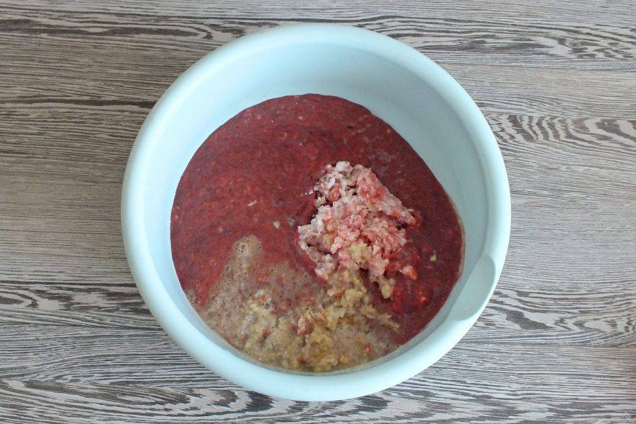 Мясную прослойку перекрутите через мясорубку со средней решеткой.