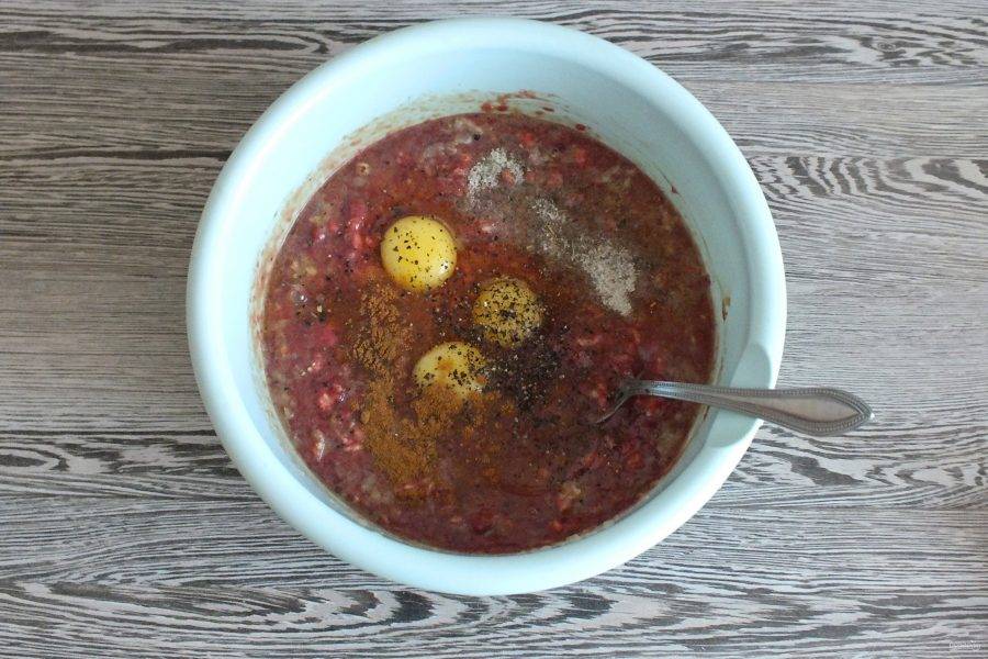 В полученную массу добавьте яйца, молоко, мускатный орех, черный перец, соль. Перемешайте.