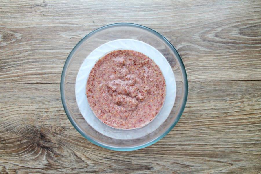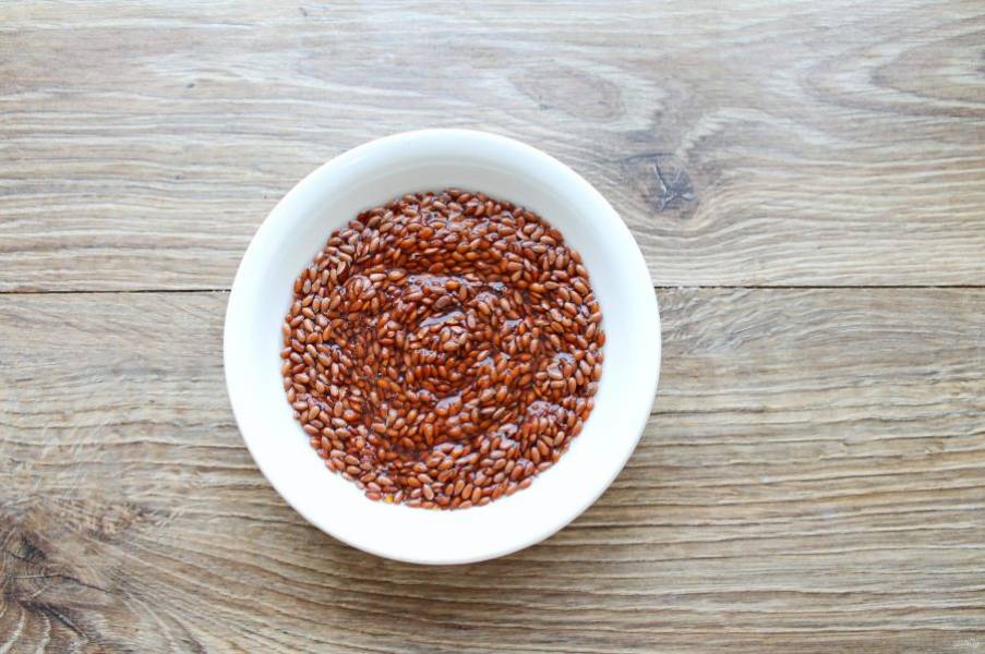 Семя льна залейте холодной, кипяченой водой и оставьте на 12 часов. Переложите в миску подходящую для взбивания.