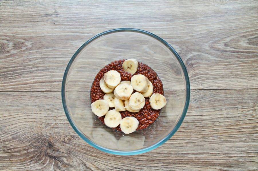 Банан очистите и порежьте на кружочки, добавьте в миску со льном.
