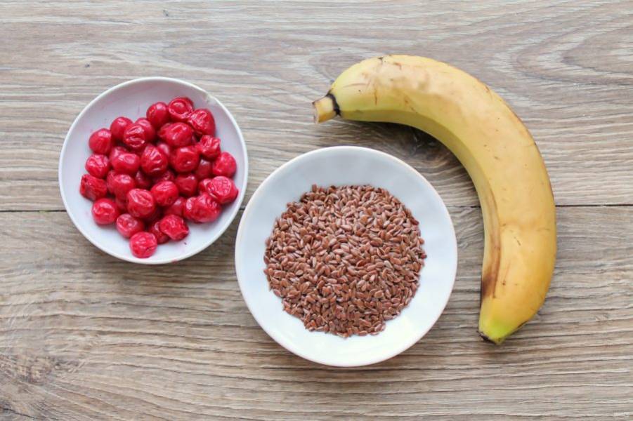 Подготовьте все необходимые ингредиенты для приготовления льняной каши с вишней.