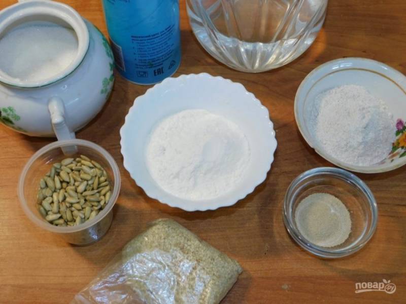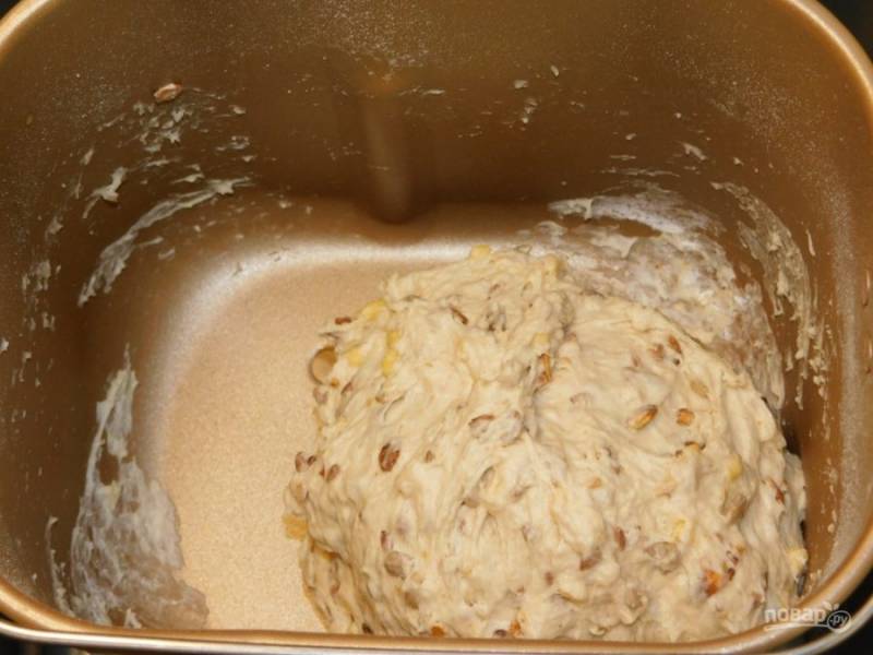 Добавьте два вида муки и дрожжи. Семена положите в специальный отсек. Если такого нет, то тоже к муке.