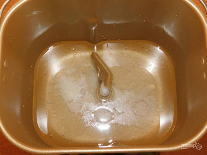 В чашу хлебопечки налейте воду и растительное масло. Добавьте соль и сахар.