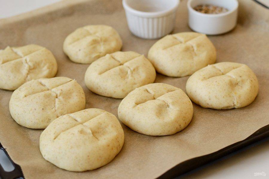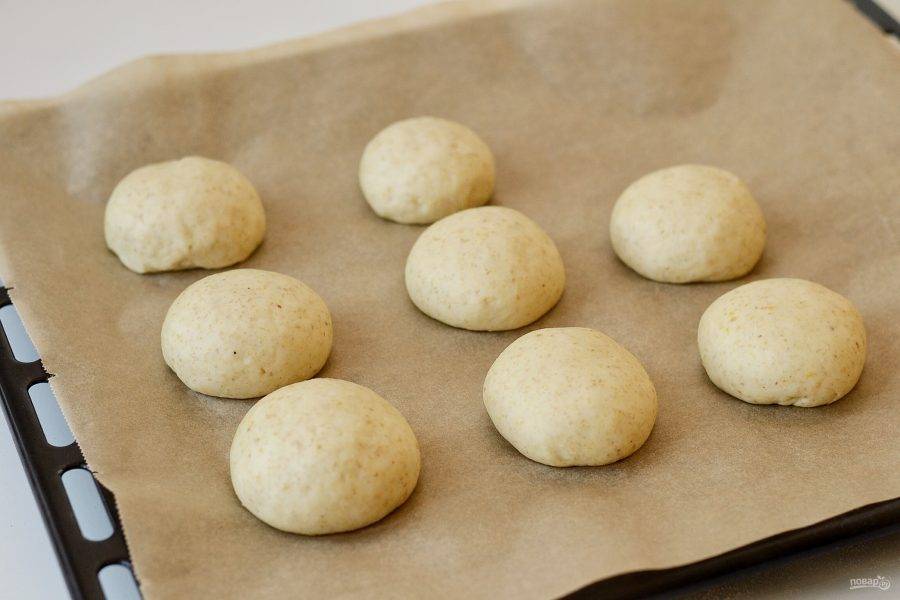 Получившееся тесто выложите на поверхность присыпанную мукой. Разделите тесто на 8 булочек. Накройте их чистым полотенцем и оставьте на 20 минут подняться.